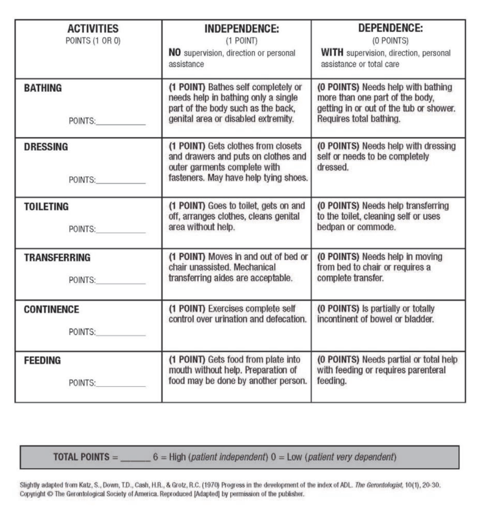 There are many checklists and scales available to see if a senior is having issues with ADLs or IADLs. These checklists will help gauge the need for assistance, whether it is a family member that needs to check in with their loved one once a week, or if a professional caregiver is needed for multiple hours a week.Most seniors will not go from fully independent to total dependence overnight. There will be a decline over time, and their need may increase. Using the Katz Index of ADLs, you can quickly identify the need for the senior.